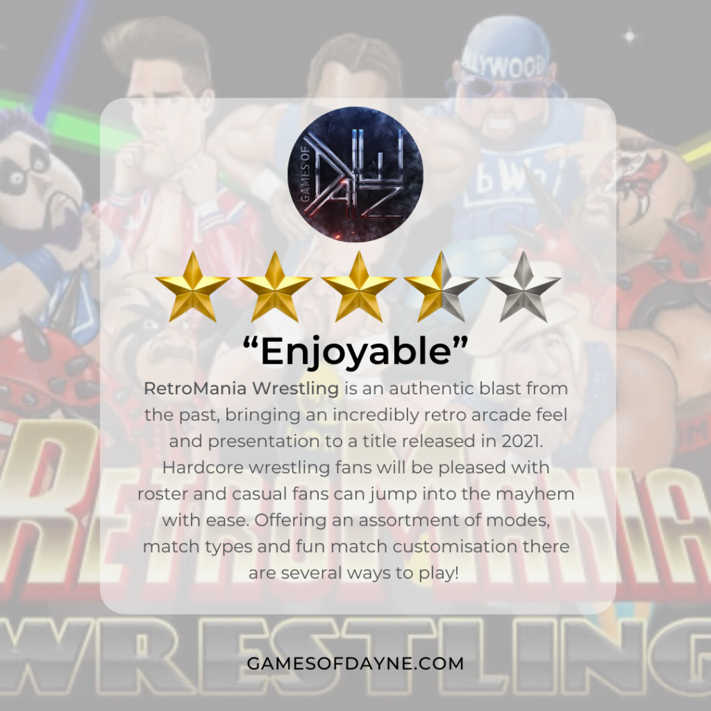 There is nothing modern about RetroMania Wrestling and that couldn’t be more of a compliment. This genuinely feels like a title you could play on an arcade gaming machine like the good old days. With a roster appealing to diehard wrestling fans and gameplay accessible to even the most casual of players, even with no wrestling knowledge as far as games or the product itself goes. As someone who has followed wrestling on television since 2003, and has played a large number of the arcade titles that have inspired this game, this is a rare opportunity to play what feels like a game from the past with legends that paved the way for some of the young and upcoming stars that can stand opposite them in RetroMania Wrestling.