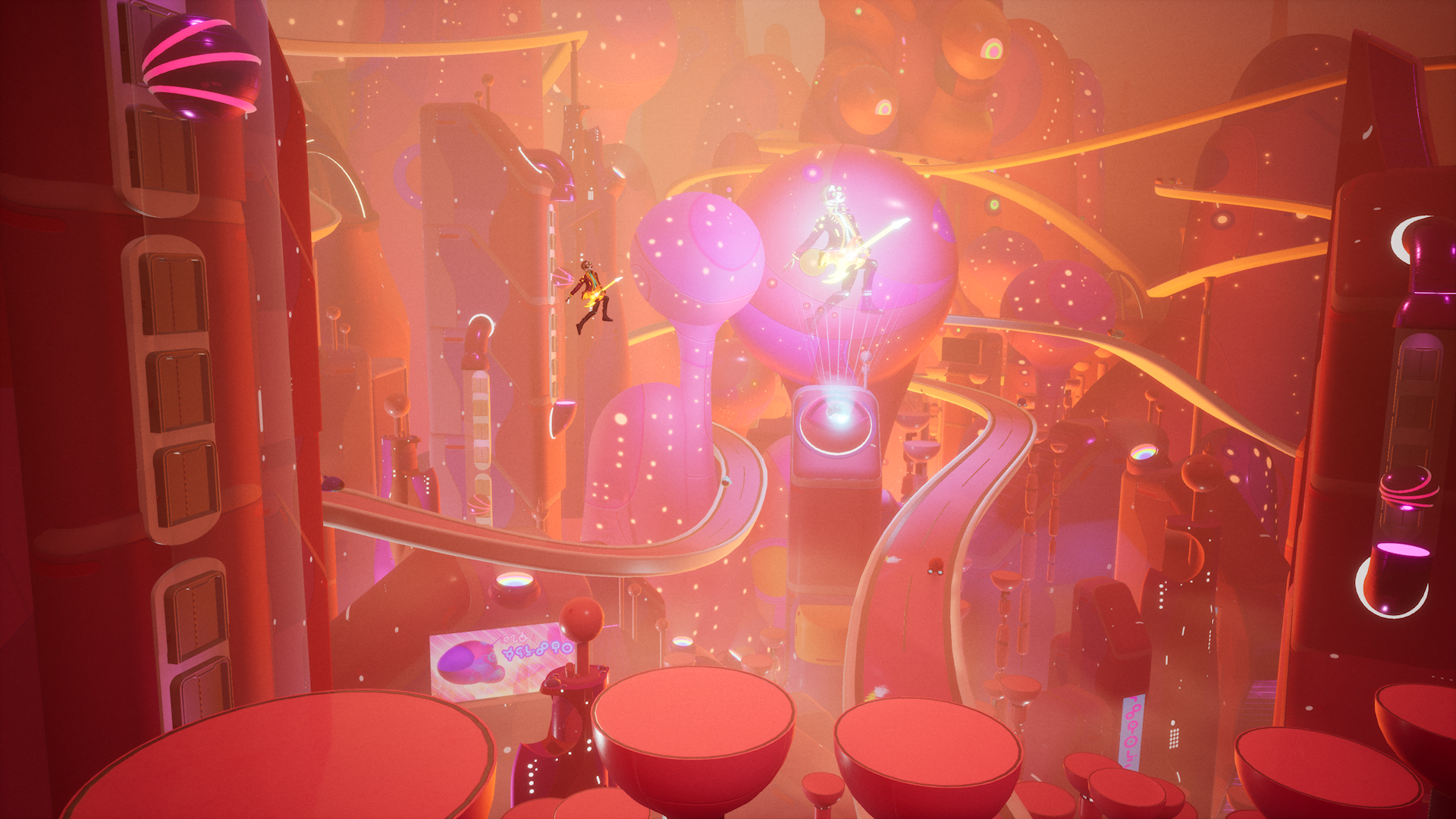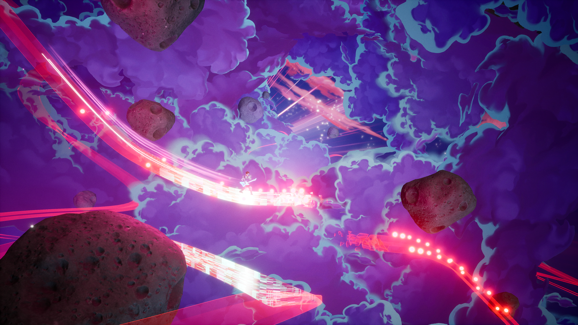 The use of stunning lateral tracking shots pulls the camera back as Francis continues forward to the right, capturing the insanely beautiful environment and the light show triggered from the guitars thunderous chords. It’s mesmerising, awe-inspiring and pretty unforgettable. The camera tightens up and gets in close when passing through hub areas but it’s the moments where there is nothing but Francis and the open space-road, so to speak, that lets The Artful Escape tell a visual story worthy of its excellent audio counterpart.